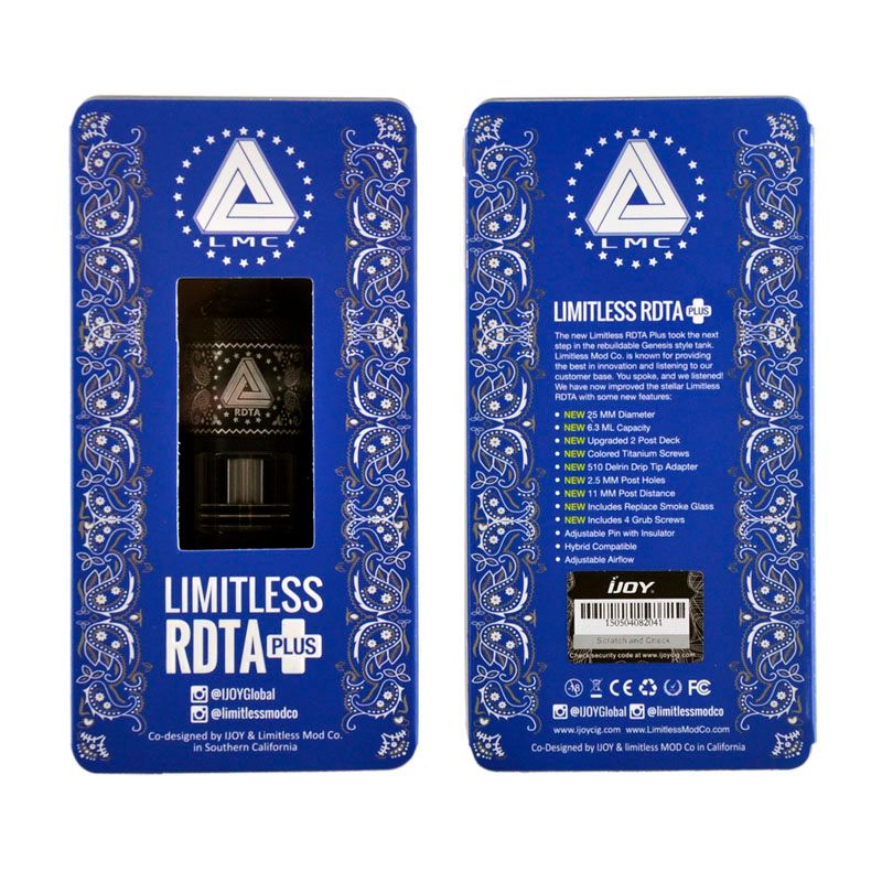 Limitless RDTA by Ijoy - Vaping Post The Limitless RDTA is a hybrid. In fact, it adopts the basics of a dripper to which the designers added a tank for autonomy. Very wide (24.2 mm), the Limitless is a top-coil, built on a Velocity-type mounting plate wit 2 plots and 4 inputs. Its drip-top, with a diameter of 11 mm, sets the tone: this RDTA is made for big clouds, what is ...