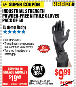 9 mil Nitrile Powder-Free Gloves, X-Large, 50 Pack - Harbor Freight Tools 68512 Brand HARDY Application Ideal for use with industrial solvents, fertilizers, cleansers, janitorial, painting, maintenance, automotive and farm use Color Black Material Nitrile Quantity 50 Shipping Weight 1.55 lb. Size (s) X-Large Thickness 9 mil Note: Specifications are approximate and subject to change Warranty 100% Satisfaction Guarantee!